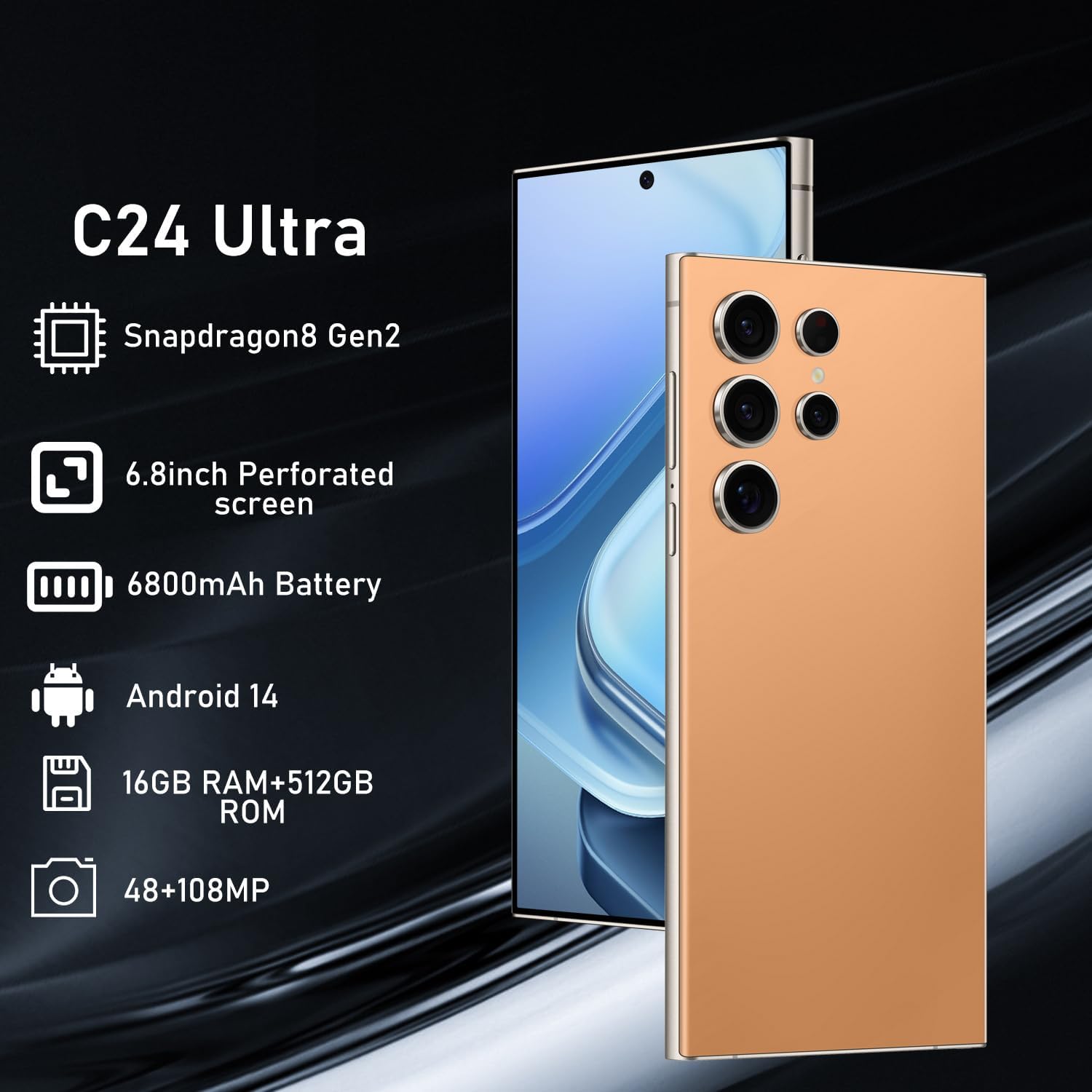 The C24 Ultra boasts a stunning 6.8″ HD display with a resolution of 3200×1440, providing a cinematic experience that is both vivid and immersive. The screen’s 120Hz refresh rate ensures seamless transitions and actions, making it ideal for gaming, video streaming, and everyday use. The phone’s design, while not explicitly detailed in the product description, is hinted at through the provided images, showcasing a sleek and modern aesthetic that appeals to a wide range of users.