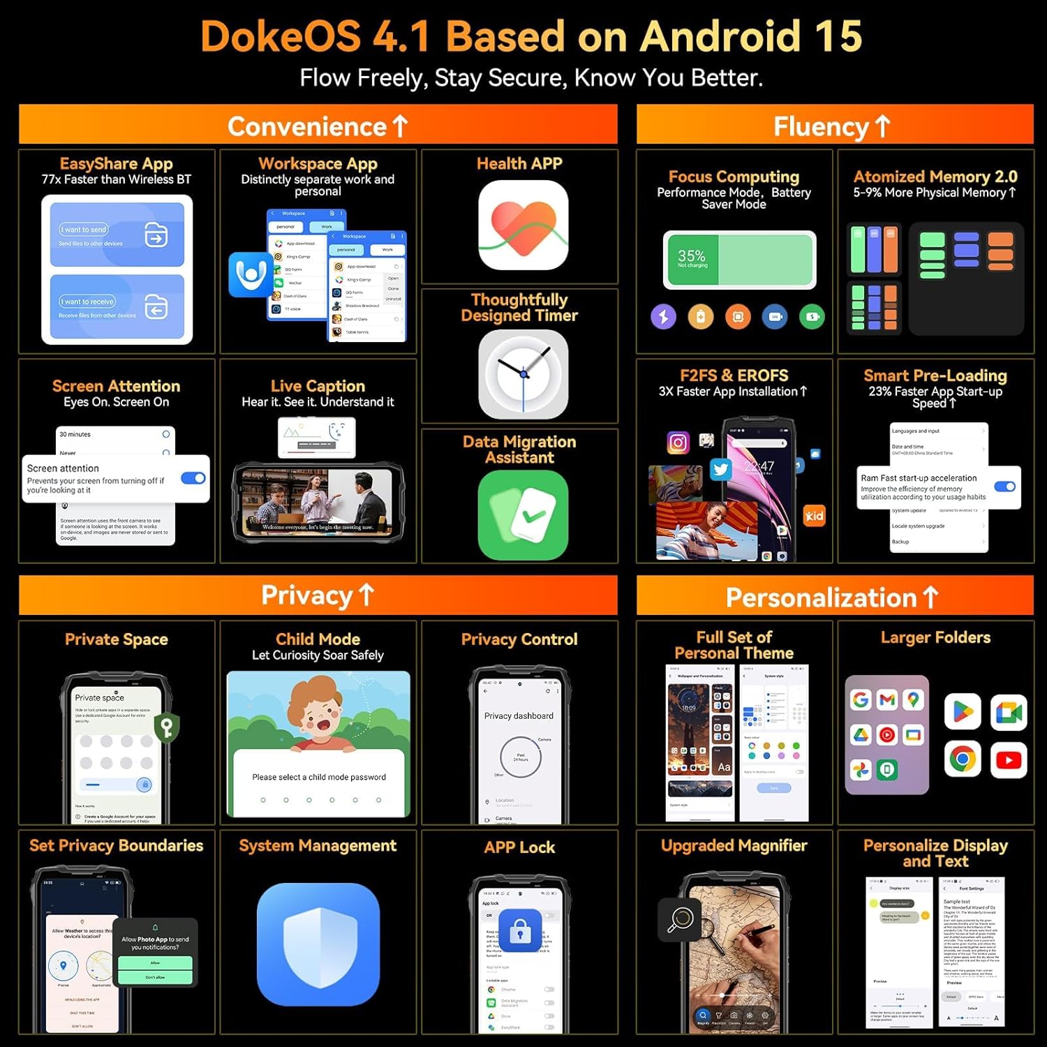 The Blackview BL7000 runs on the latest Android 15 operating system, which provides a smooth, secure, and intuitive user experience. The phone also features Doke OS 4.1, which offers advanced AI capabilities, such as smart Q&A, voice chat, and predictive text. With Doke AI and Gemini 2.0, users can explore advanced features like image and video editing, music creation, and more, making the phone a powerful tool for creativity and productivity.