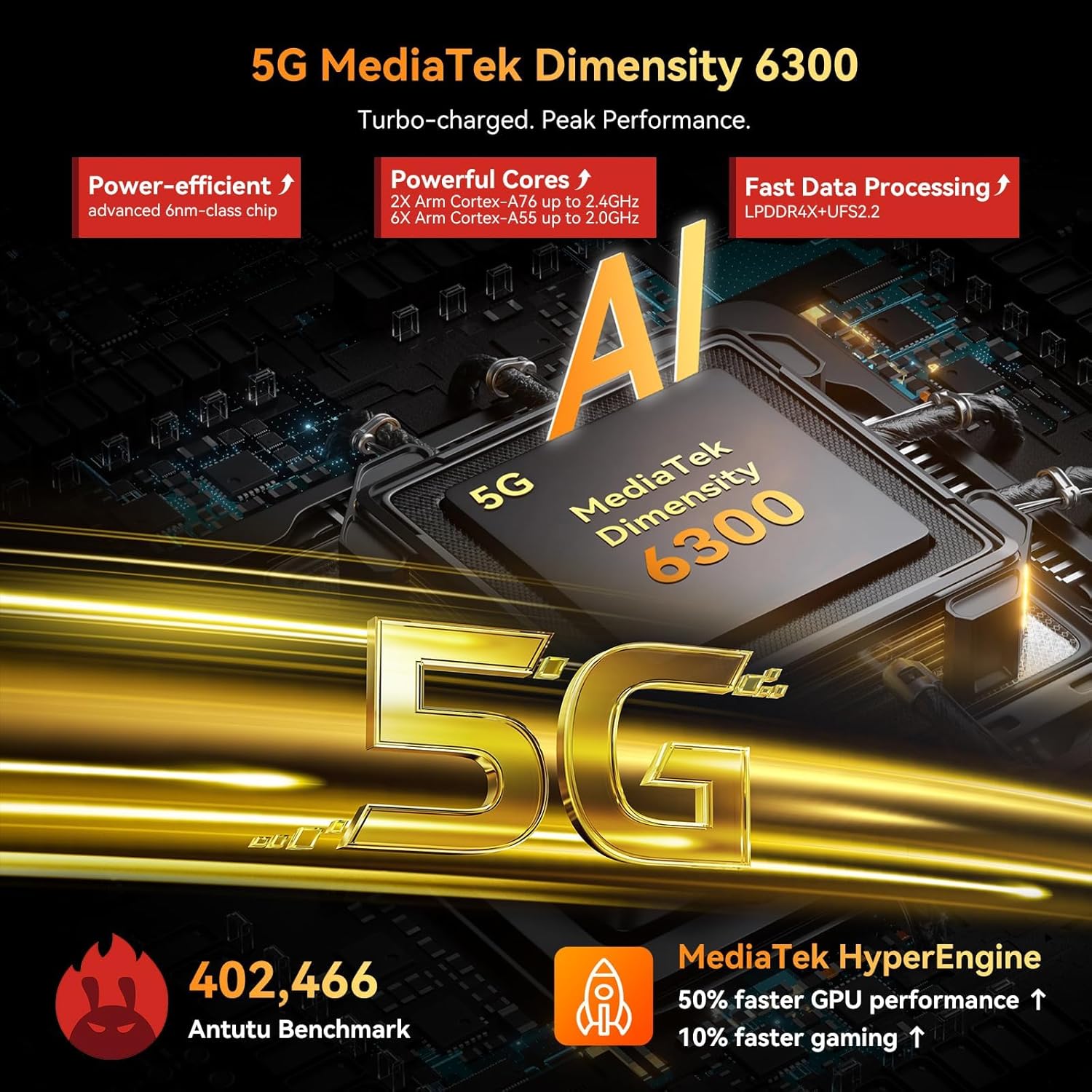 The Blackview BL7000 is powered by the MTK Dimensity 6300 processor, which delivers lightning-fast 5G connectivity and rapid downloads of large files and games. The phone comes with up to 24GB of RAM (including 16GB of virtual RAM) and 256GB of ROM, which can be expanded to an impressive 2TB via TF card. This ensures seamless multitasking and ample storage for all your applications, photos, videos, and documents.