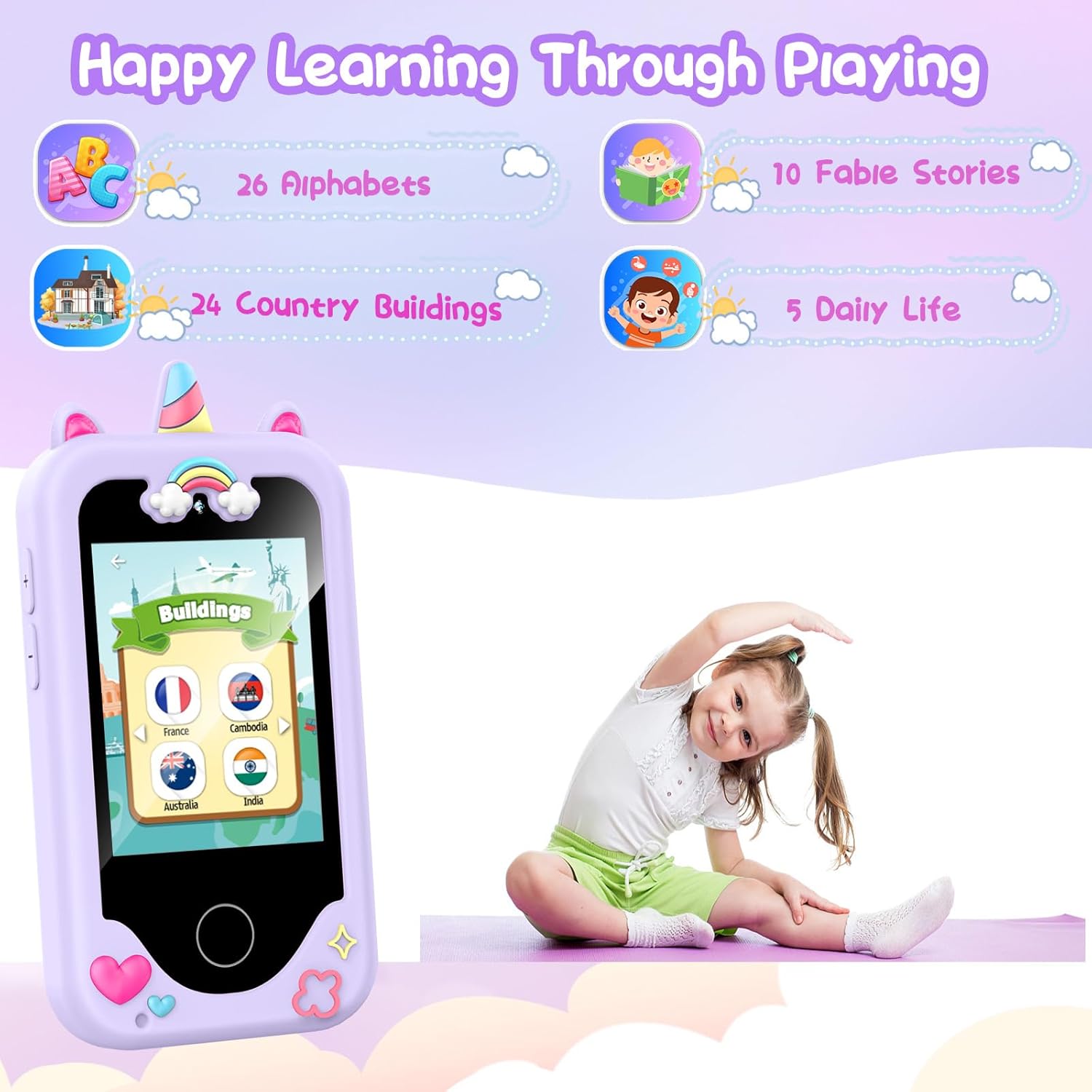 One of the standout features of this toy phone is its educational content. The phone includes 26 alphabet lessons, 10 storybook fables, 24 country landmarks, and 5 daily activities, all designed to promote learning and development. Additionally, the phone features 13 puzzle games that help improve logic, thinking, and reaction skills. These educational features make the Kids Smart Phone Gift Toy an excellent tool for parents and educators seeking to promote learning and cognitive development in children.